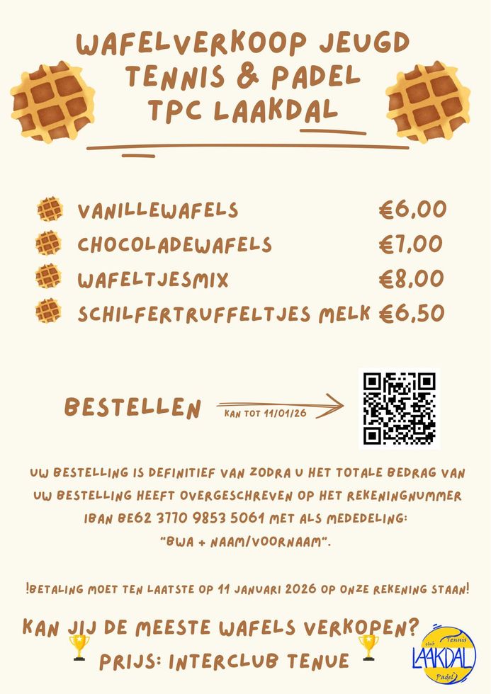 Onze jaarlijkse wafel- en truffelverkoop is er weer, ten voordele van de jeugdwerking van TPC Laakdal. Met jouw steun investeren we in beter materiaal en extra kansen voor onze jonge tennis -en padeltalenten.