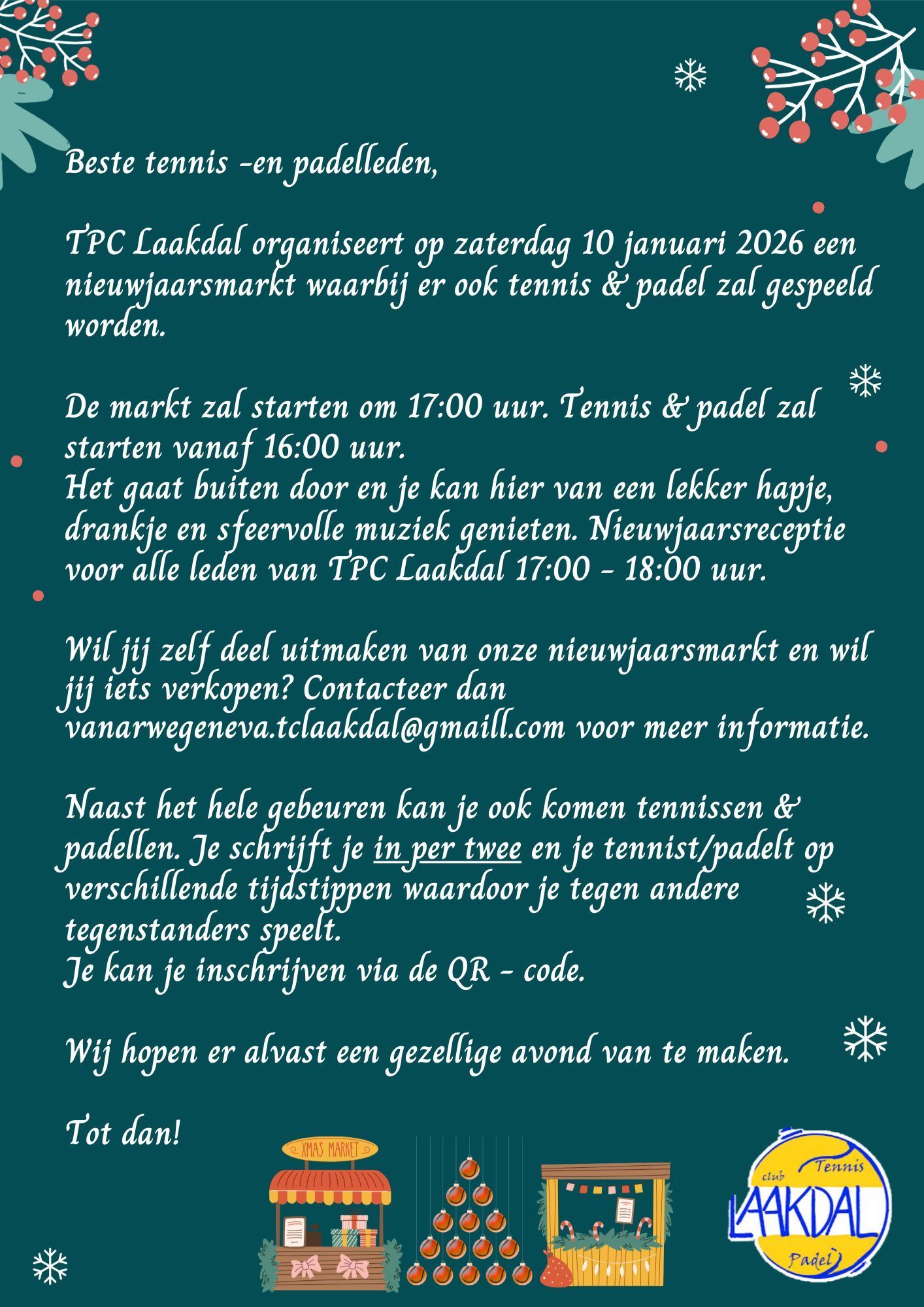 TPC Laakdal organiseert op zaterdag 10 januari 2026 een nieuwjaarshappening waarbij er ook tennis & padel zal gespeeld worden.